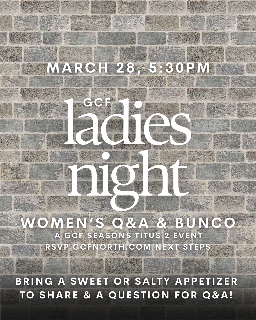 Ladies, join us for an evening of connection, conversation, and fun! We’ll enjoy a Women’s Q&A together, followed by Bunco. This GCF Seasons Titus 2 event is a great opportunity to build friendships and encourage one another. Bring a sweet or salty appetizer to share and come with a question for the Q&A.